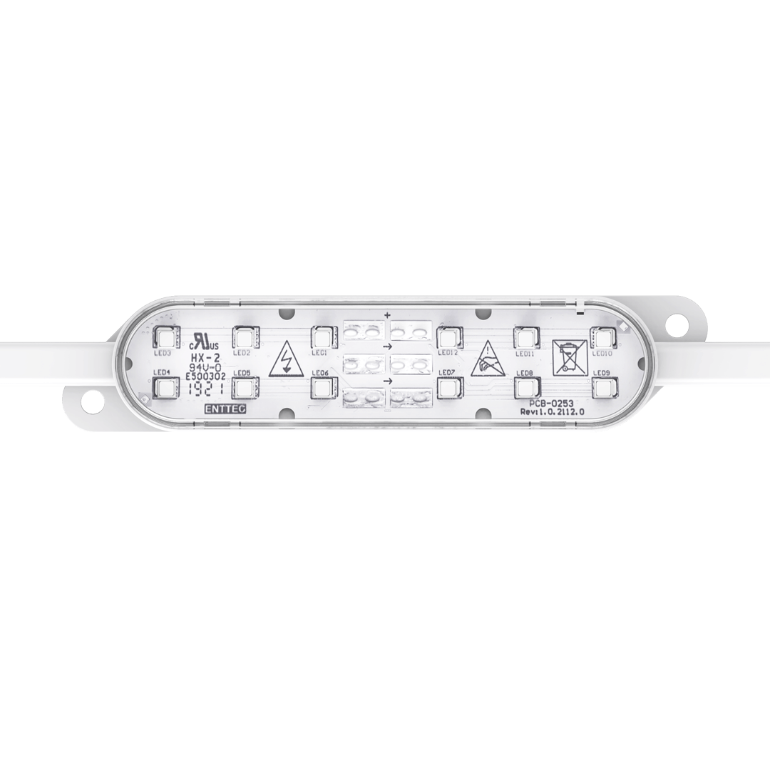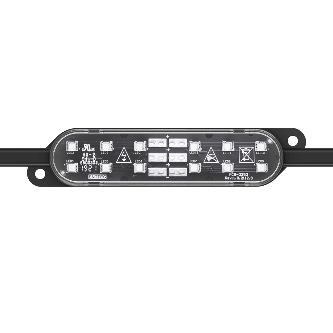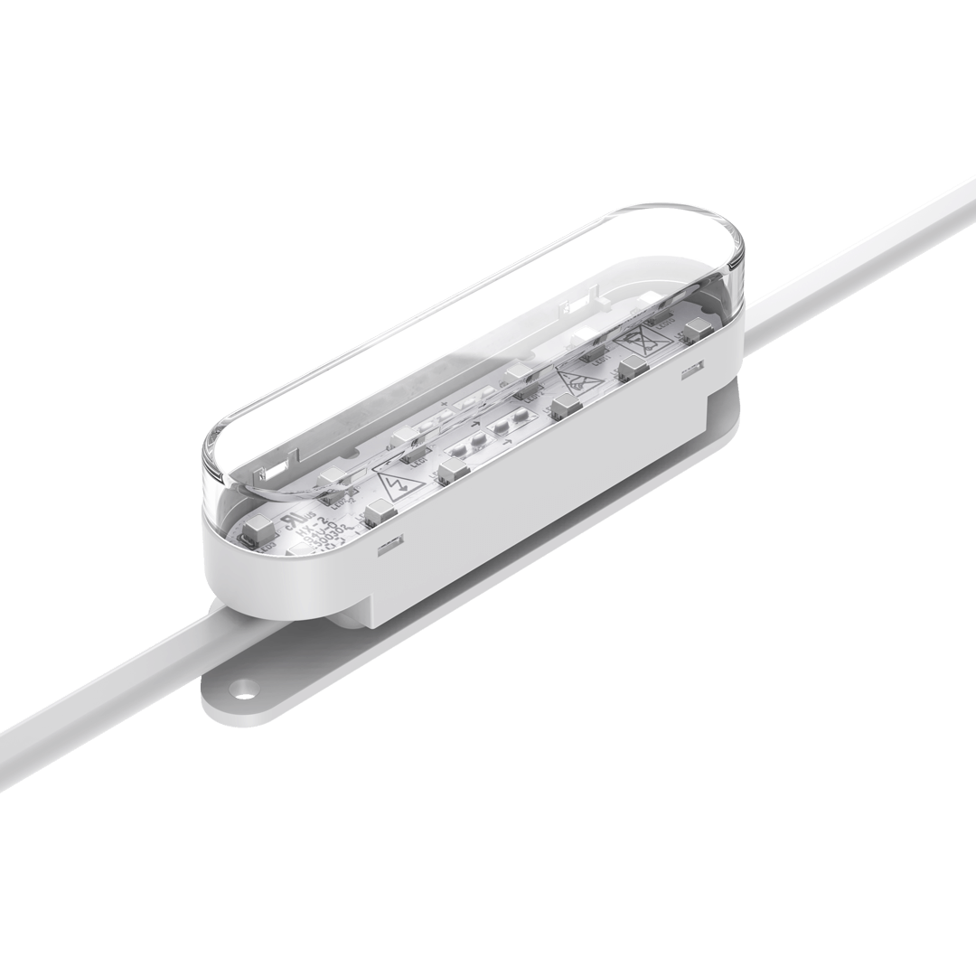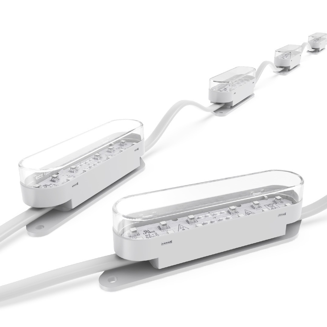 Flexible strings of ultra-bright, high-resolution 100mm x 25mm RGB or RGBW LED dots — available in black or white finishes — with robust, injection-moulded cases for all-weather use.