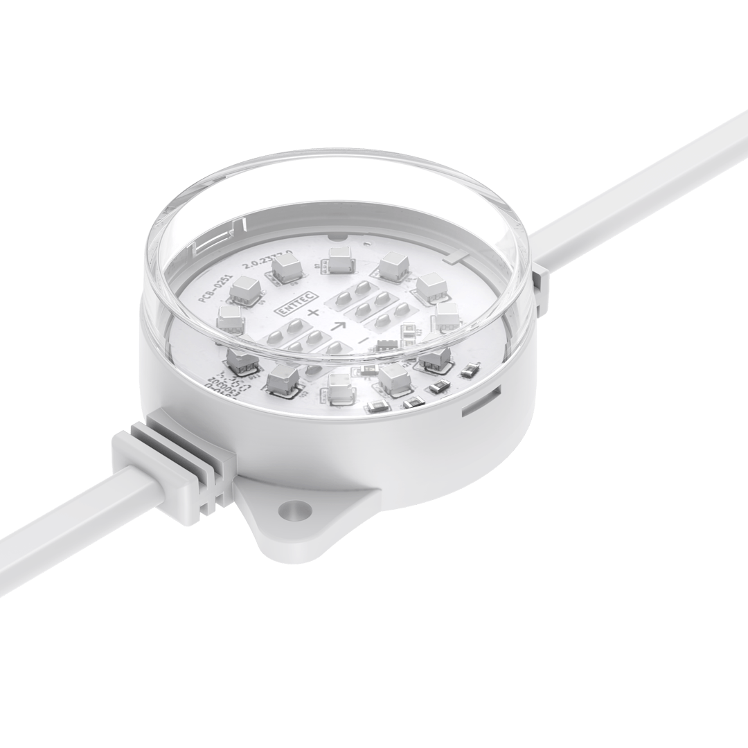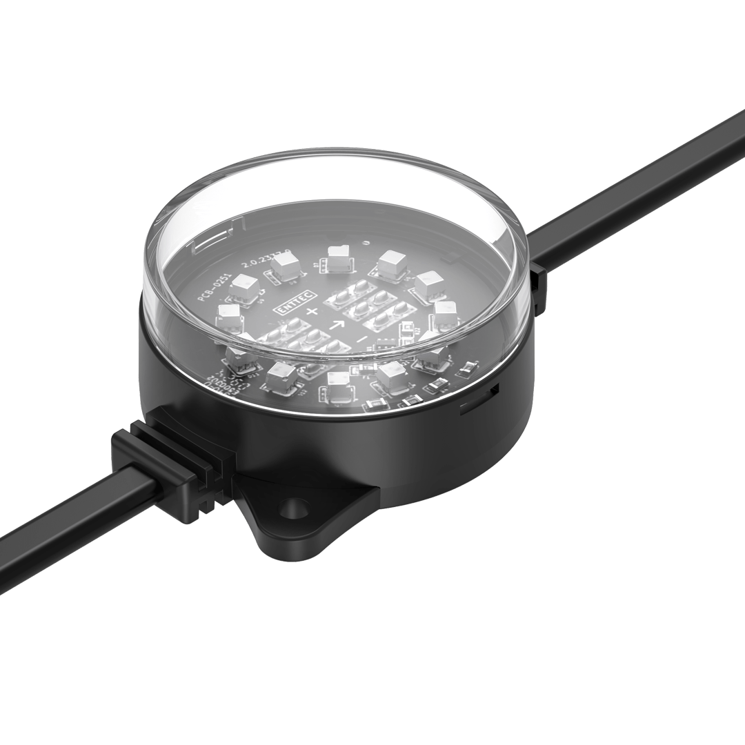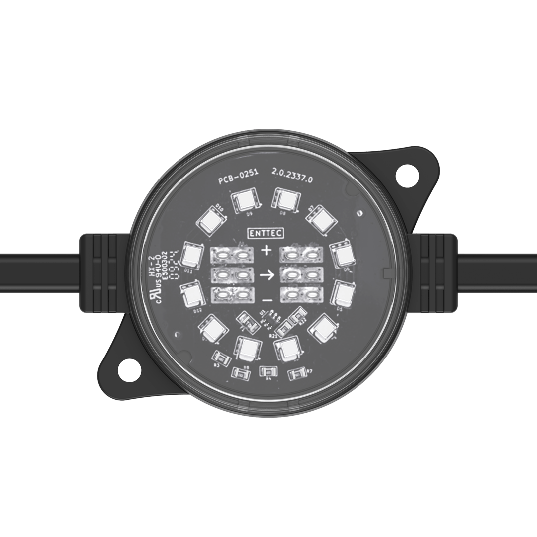 ENTTEC’s robust, high-resolution Smart PXL 60 dots are built to endure harsh environments and offered in both black and white finishes to suit a variety of design needs. Easily installed in any shape, these 55.5mm direct-view Smart PXL dots deliver crisp, dramatic lighting effects while enhancing design. Custom spacing and voltage options are available to fit various projects. Engineered by professionals for professionals, the Smart PXL range elevates architectural, commercial, and entertainment projects. Each string is made to order at our factory using cutting-edge manufacturing techniques, then shipped globally.