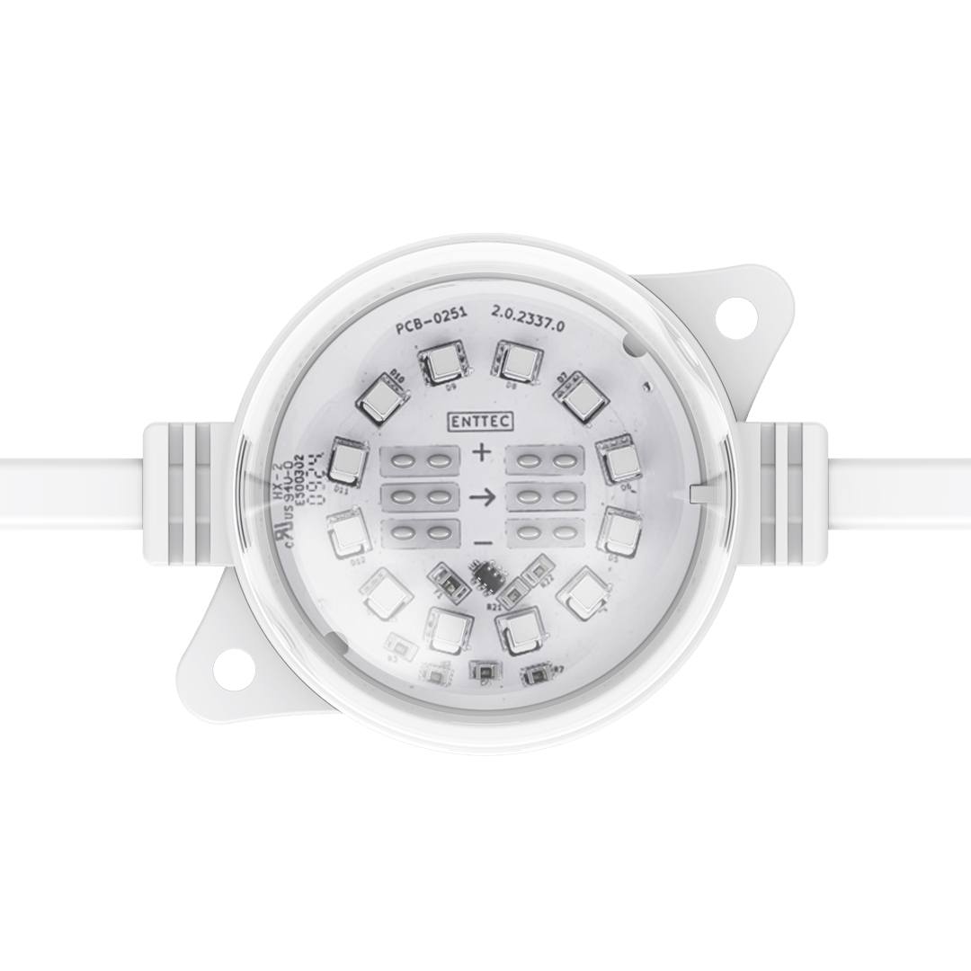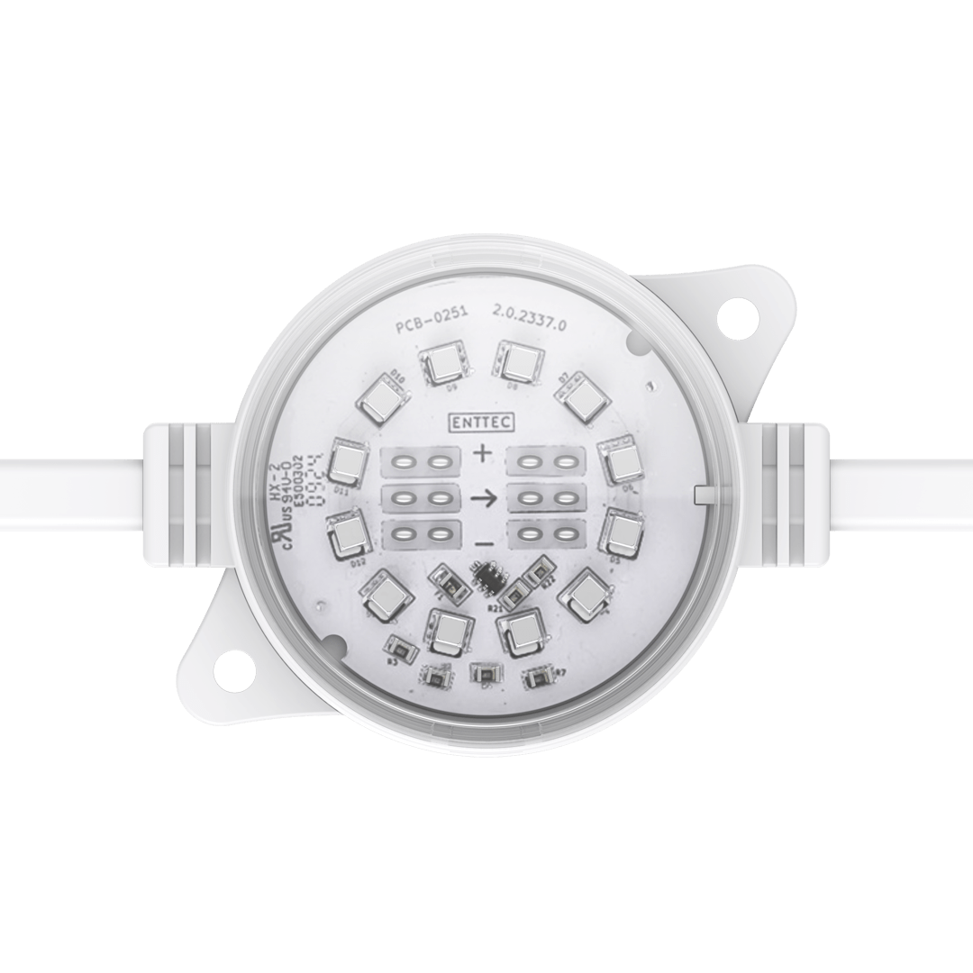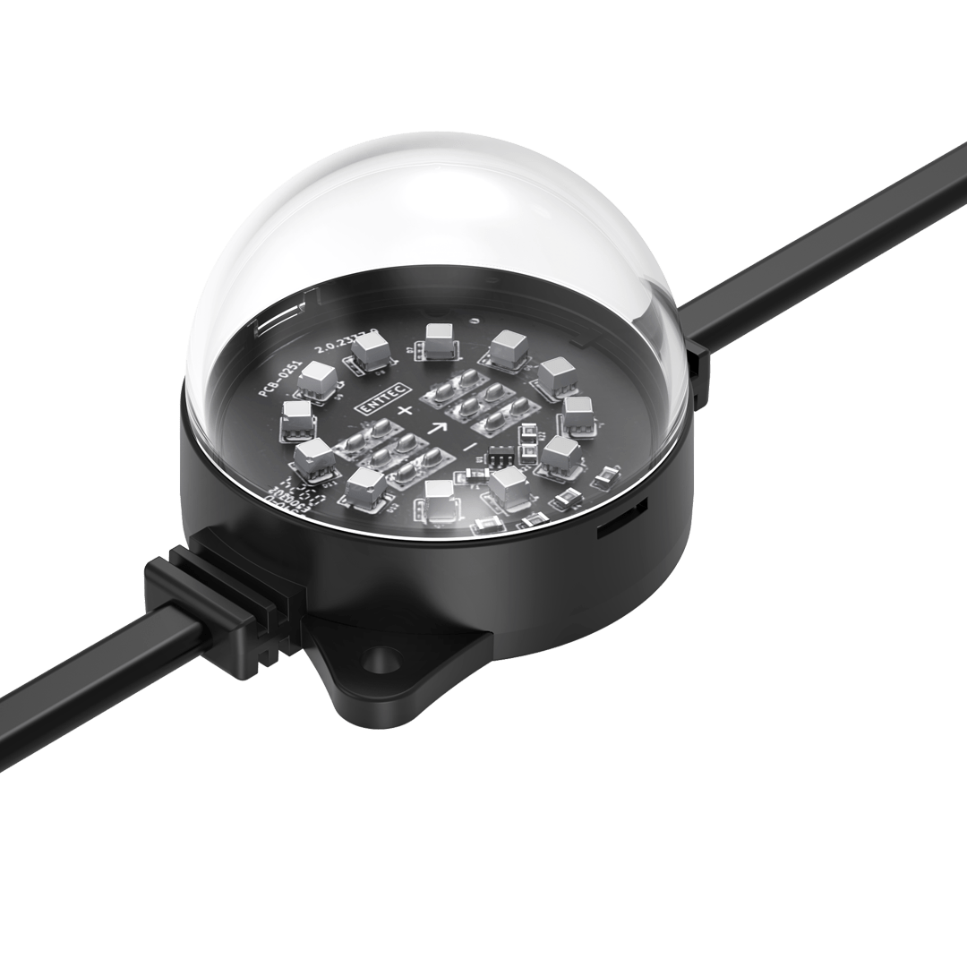 ENTTEC’s robust, high-resolution Smart PXL 60 dots are built to endure harsh environments and offered in both black and white finishes to suit a variety of design needs. Easily installed in any shape, these 55.5mm direct-view Smart PXL dots deliver crisp, dramatic lighting effects while enhancing design. Custom spacing and voltage options are available to fit various projects. Engineered by professionals for professionals, the Smart PXL range elevates architectural, commercial, and entertainment projects. Each string is made to order at our factory using cutting-edge manufacturing techniques, then shipped globally.