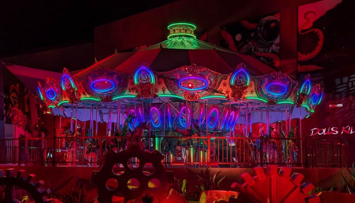 But delivering the neon-forward vision required more than swapping out lighting fixtures. It meant rethinking how a carousel could express character through light. AREA15 needed something visually assertive; something that could hold its own alongside immersive experiences like Meow Wolf’s Omega Mart, Wink World, and the venue’s constantly evolving lineup of large-format AV installations.