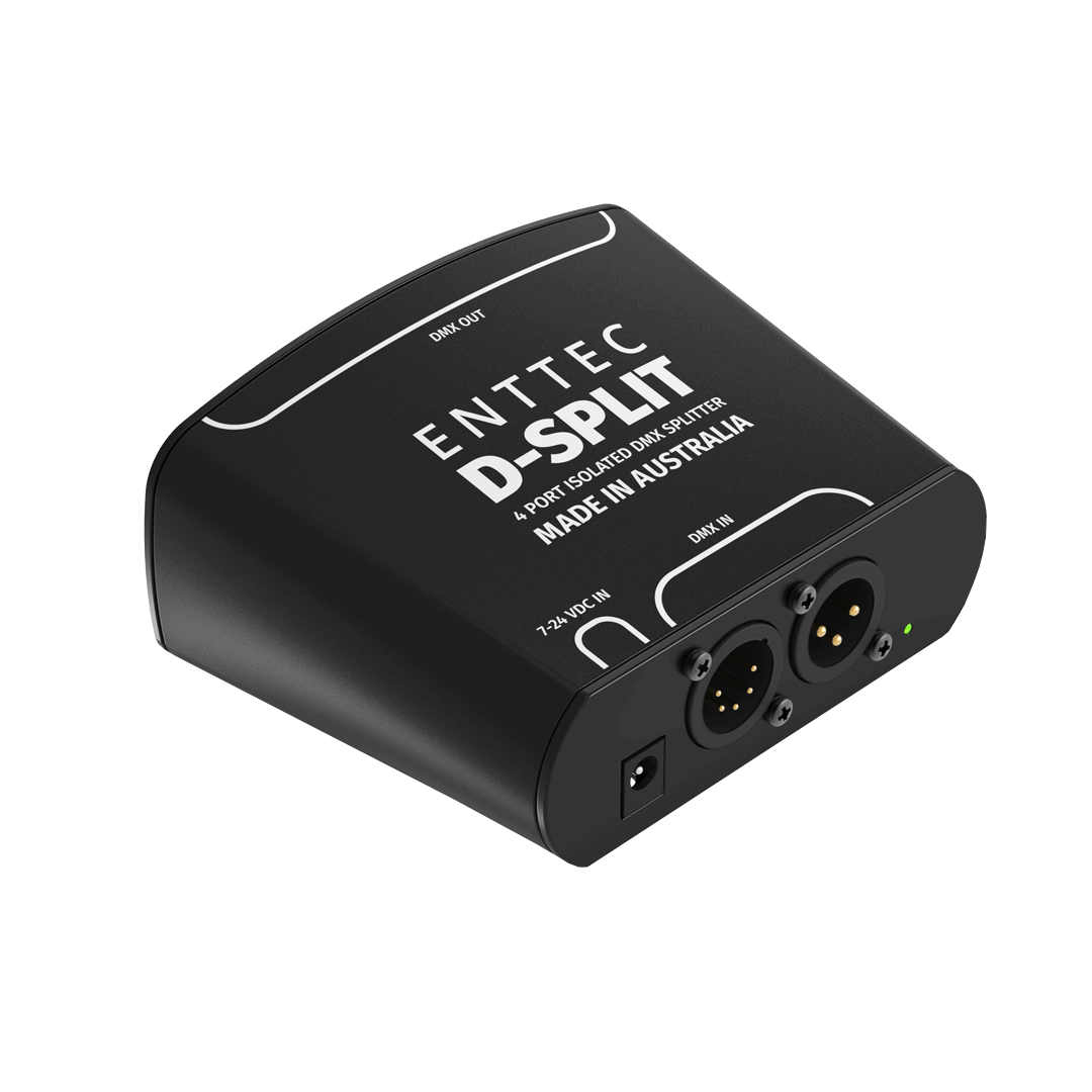 The D-Split is an optically-isolated DMX splitter and repeater for DMX512. With one input and four outputs, the D-Split gives you the ultimate flexibility to link up to 32 DMX fixtures.