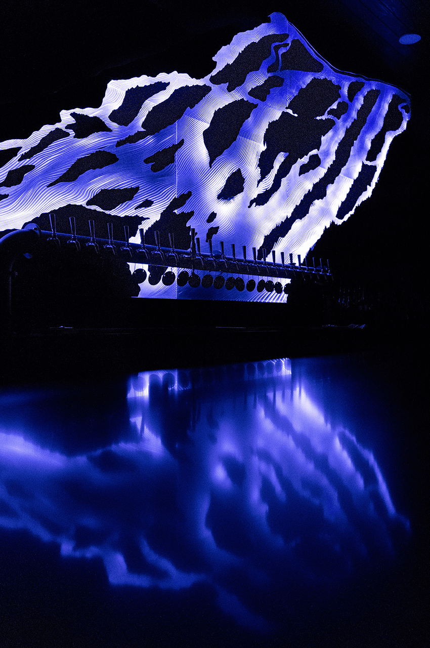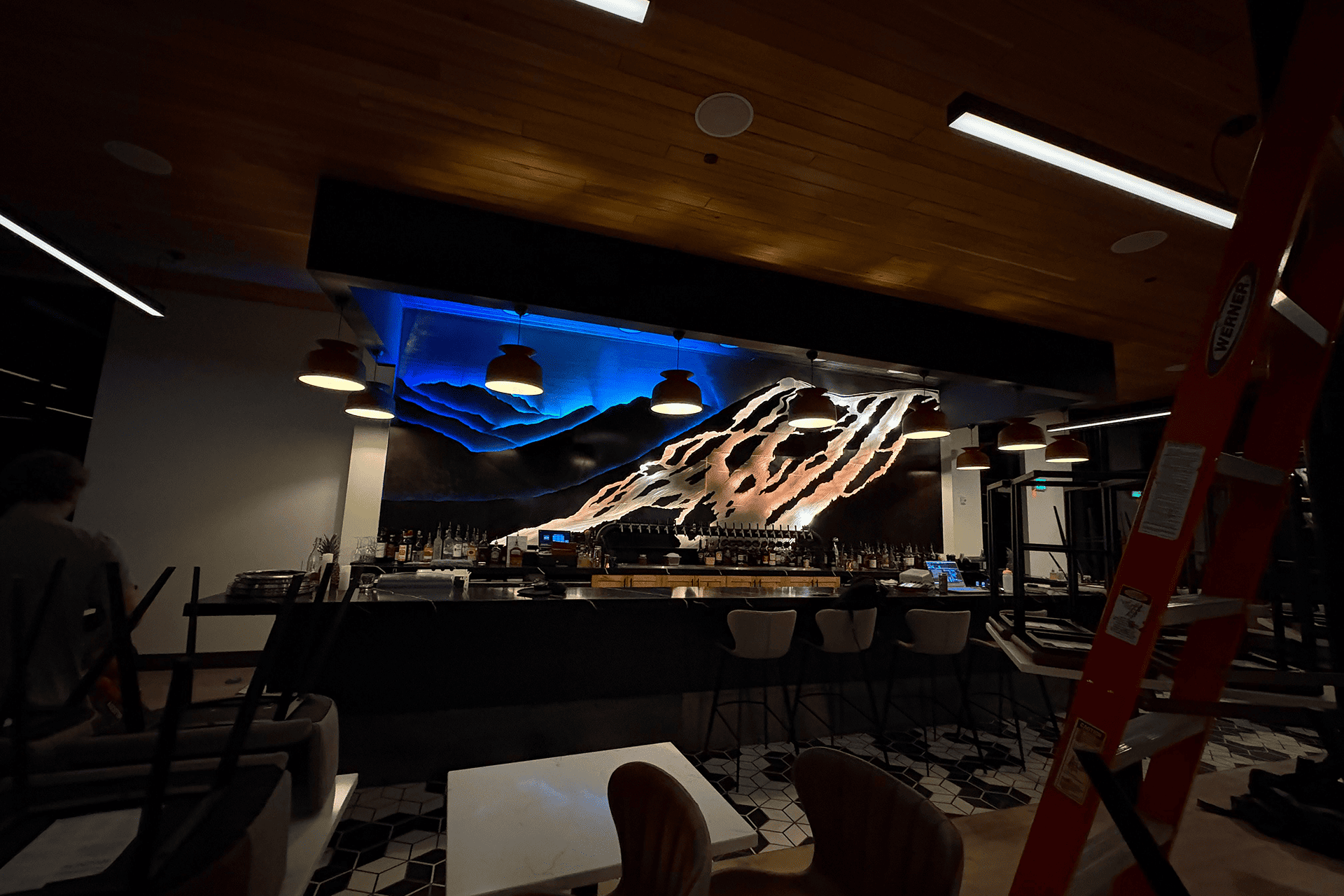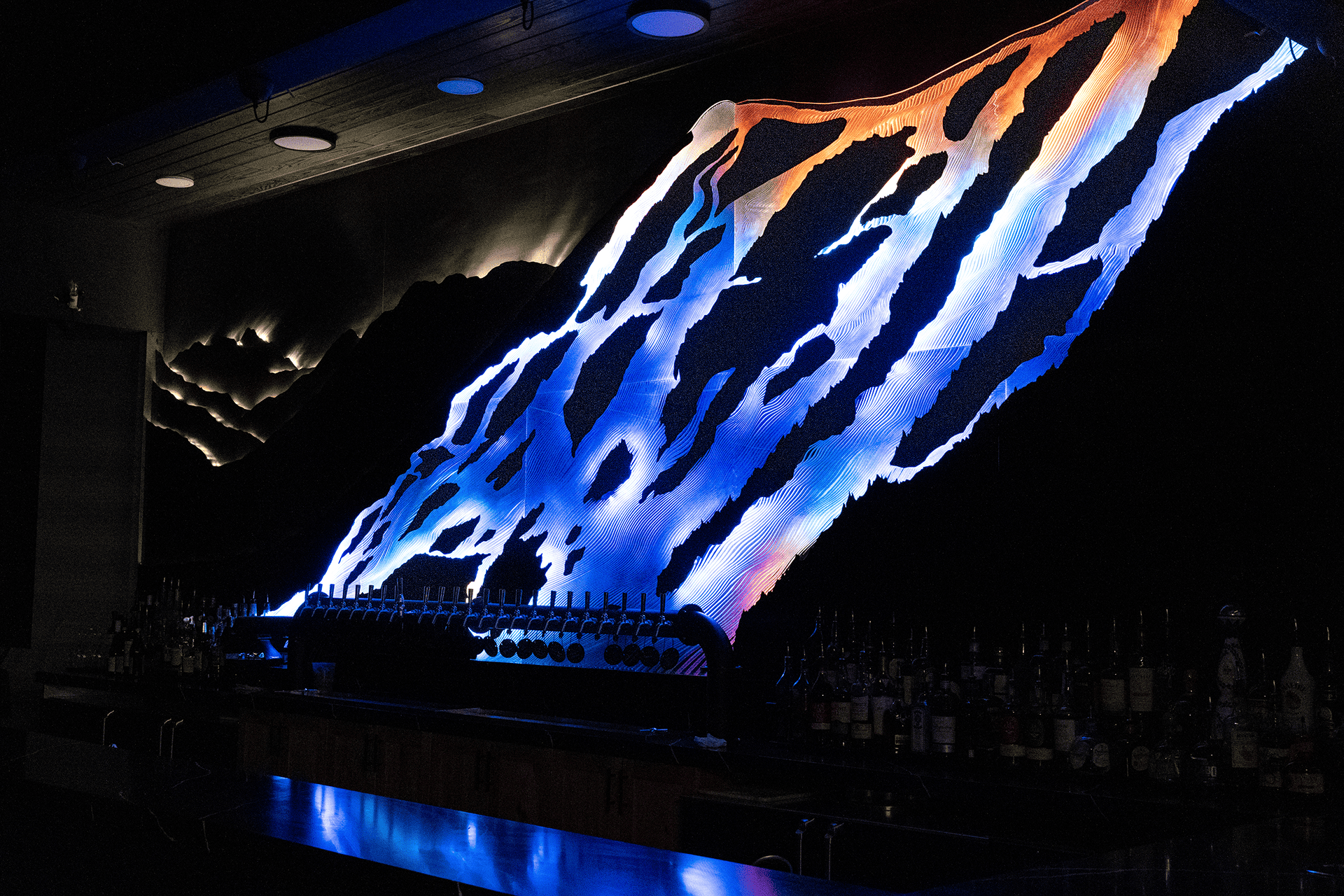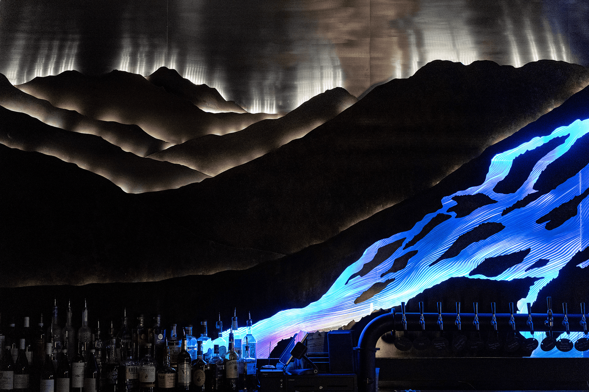 Bland Hoke, known for his bespoke multidisciplinary art installations and sculptures, was commissioned by Snow King Mountain to create the main art piece for their new summit building. During the process of designing the art piece to transform the restaurant’s main wall behind the bar into an artistic topographical design, Hoke decided to bring on Sanford who is known for his expertise in lighting.
