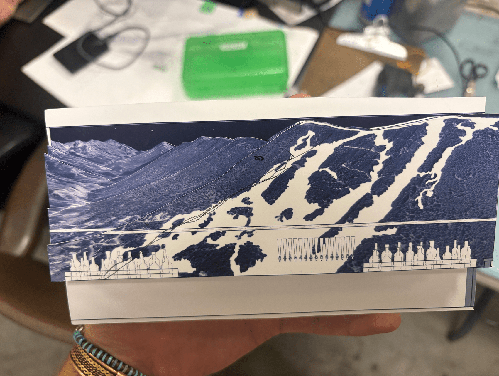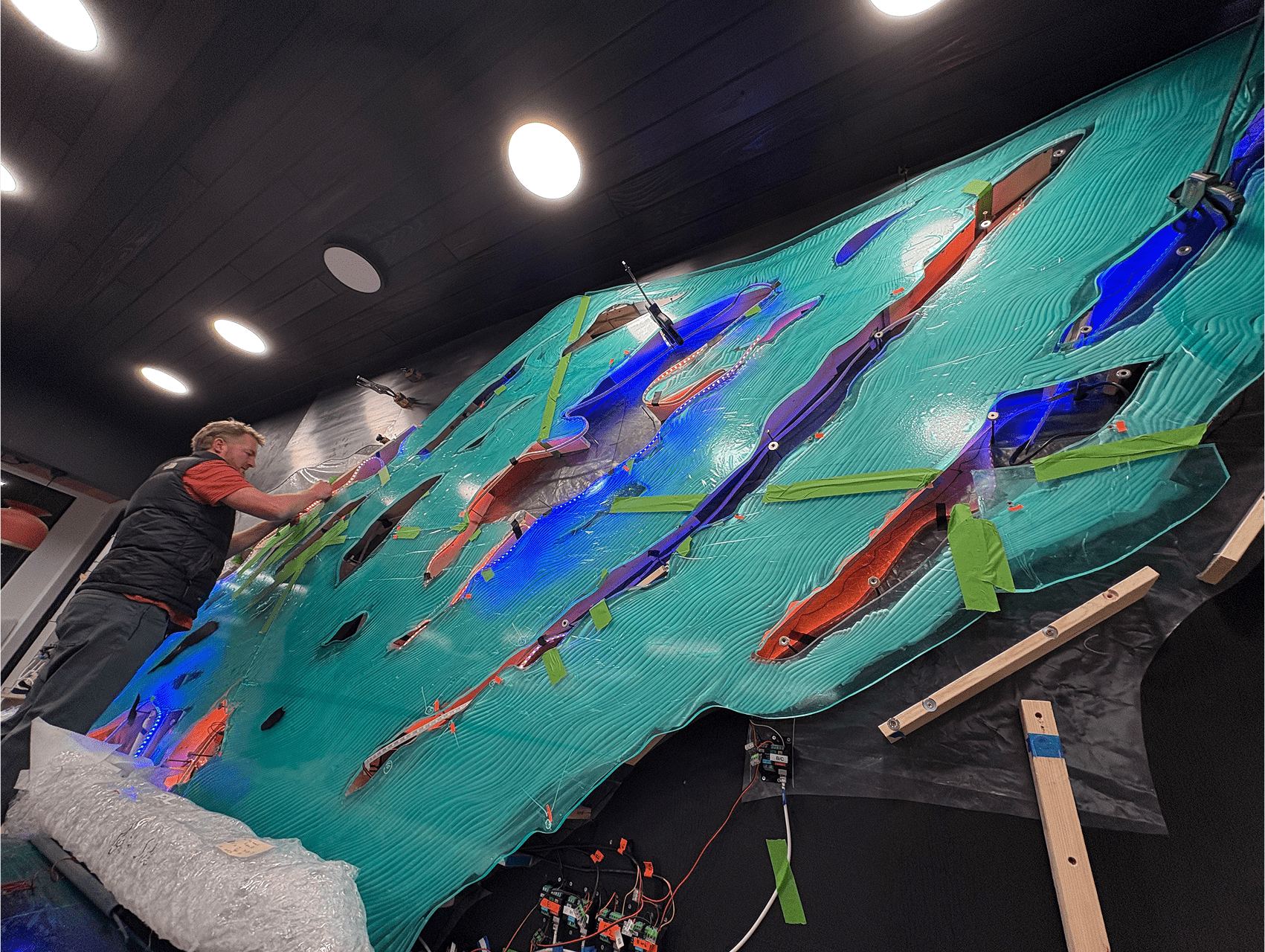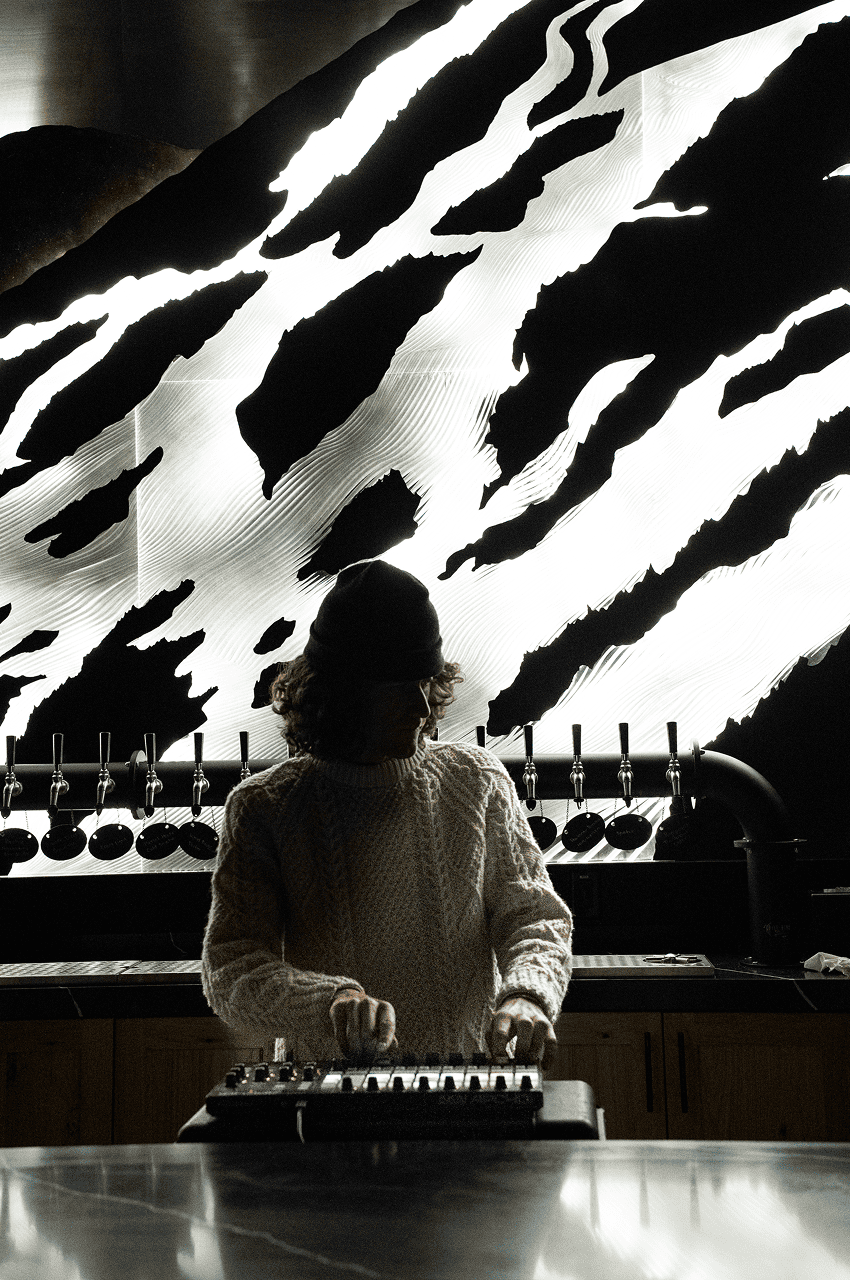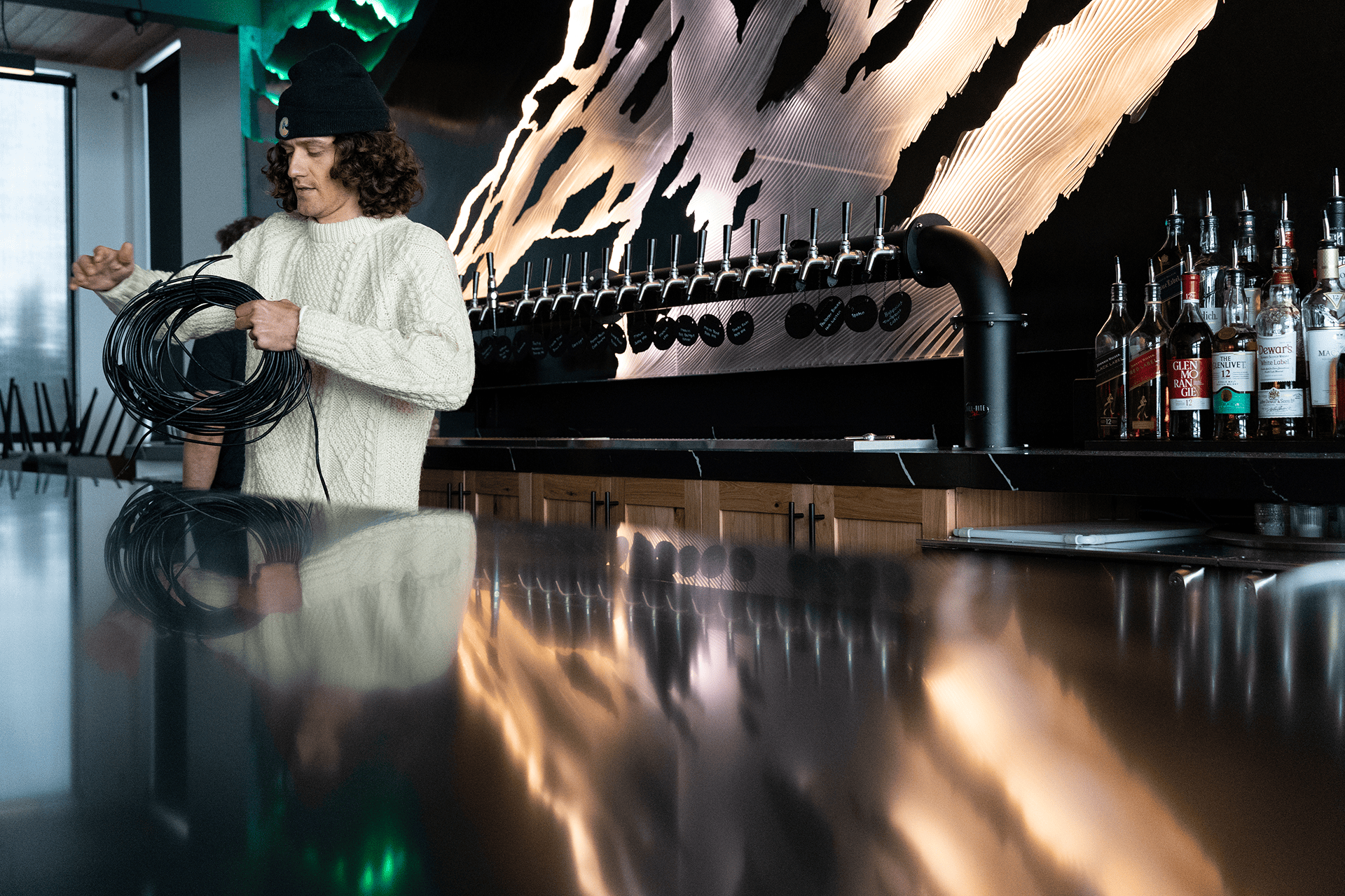 Bland Hoke, known for his bespoke multidisciplinary art installations and sculptures, was commissioned by Snow King Mountain to create the main art piece for their new summit building. During the process of designing the art piece to transform the restaurant’s main wall behind the bar into an artistic topographical design, Hoke decided to bring on Sanford who is known for his expertise in lighting.