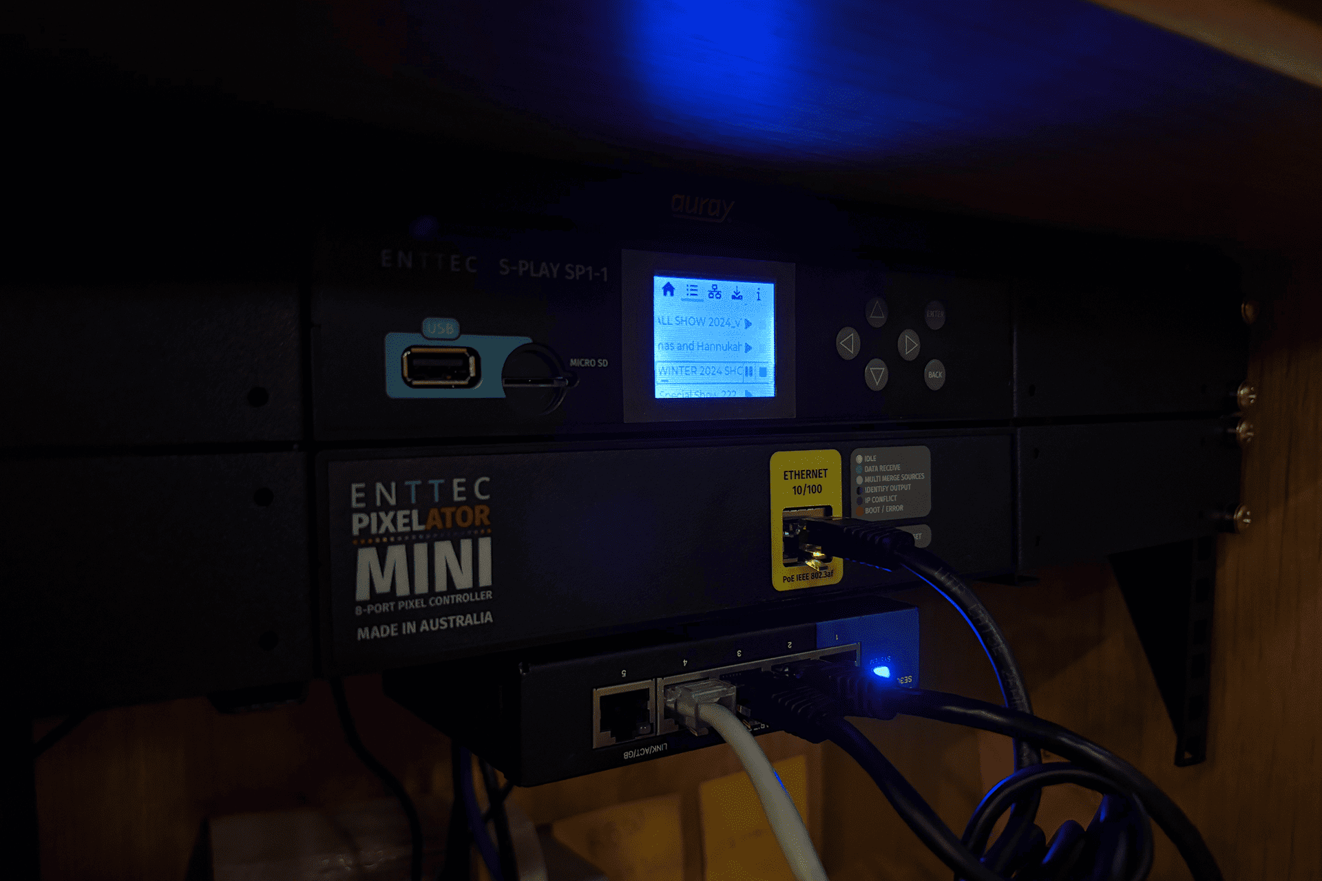 S-Play SP1-1 serves as the brain of the operation, storing and playing back programmed light shows autonomously. This ensures SnowGlow continues performing even without network connectivity—critical for a mountaintop location.