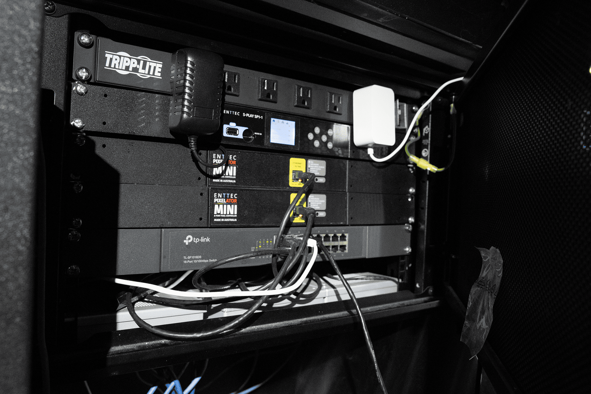 2 Pixelator Mini Mk2s handle the heavy lifting of pixel processing, each managing up to 32 universes of control. With 55 meters of RGBW strip at 60 pixels per meter, the dual Pixelators ensure smooth, synchronized effects across all 3,300 pixels without bottlenecks.