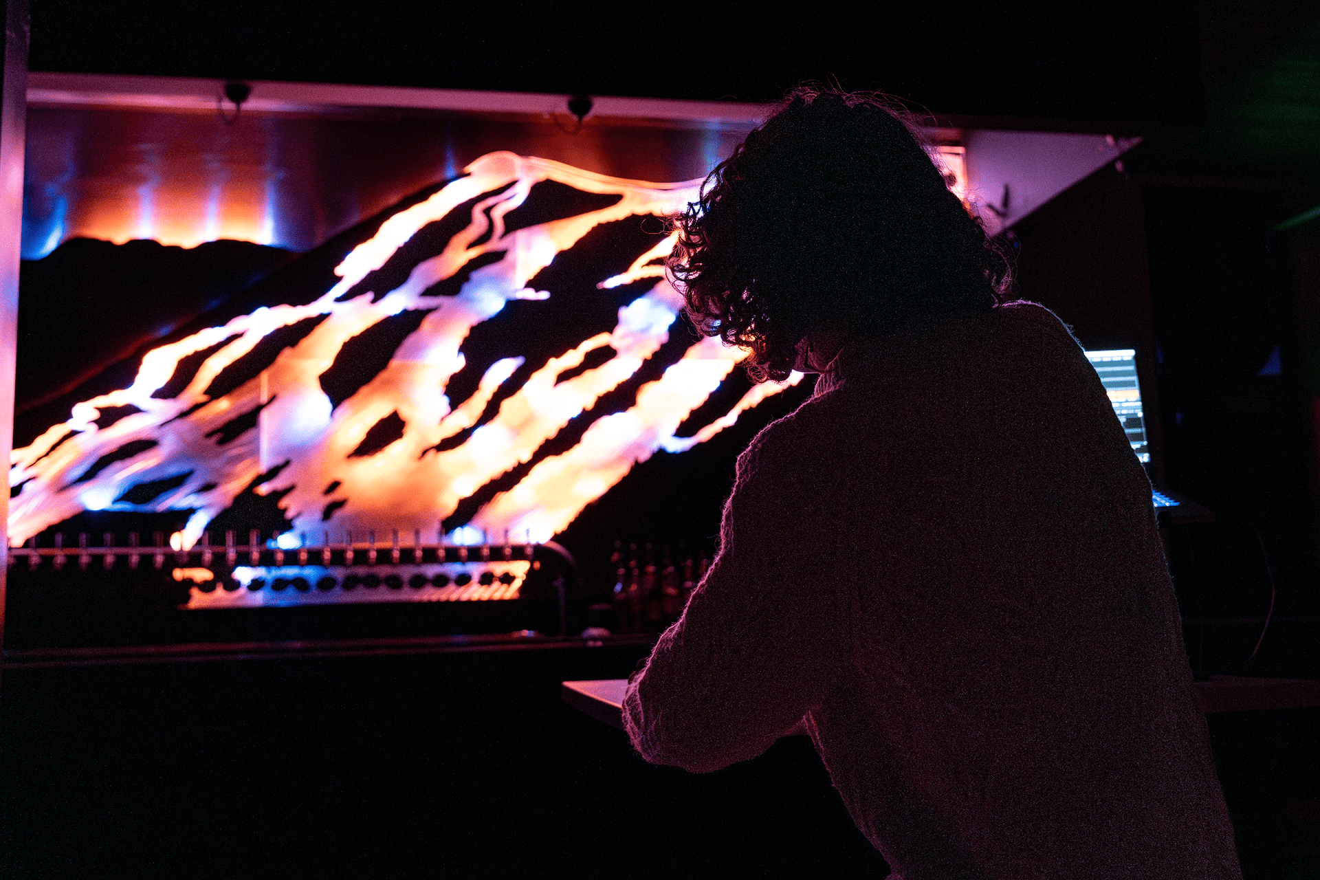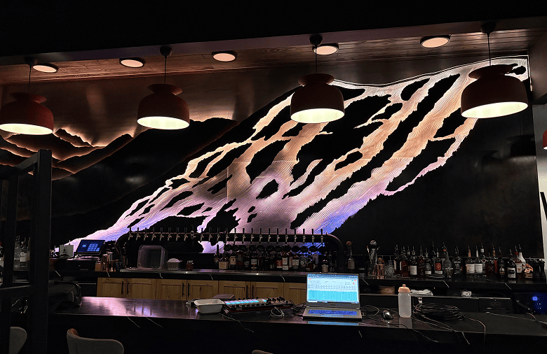Dan Sanford, a Lighting Designer and VJ whose portfolio includes stages for Bonobo and Glitch Mob, then partnered with Hoke to complete the project. Hoke designed a 24ft by 8.5ft artwork, custom layered, cut, grind, patinaed steel, as well as, CNC carved acrylic panels mimic Snow Kings ski slopes. These were then edge lit with 55 meters of ENTTEC PIXEL STRIP.