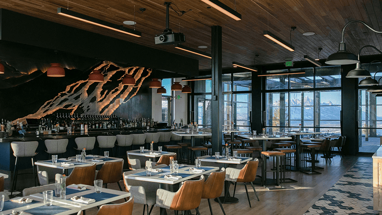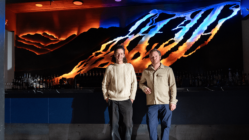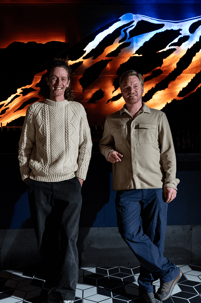 Snow King Mountain has been Jackson Hole’s “town hill” since 1939. When Aurora restaurant opened at the 7,800-foot summit in 2025, the venue commissioned local artists Bland Hoke and Dan Sanford to create a permanent lighting installation that would match its elevated ambitions.