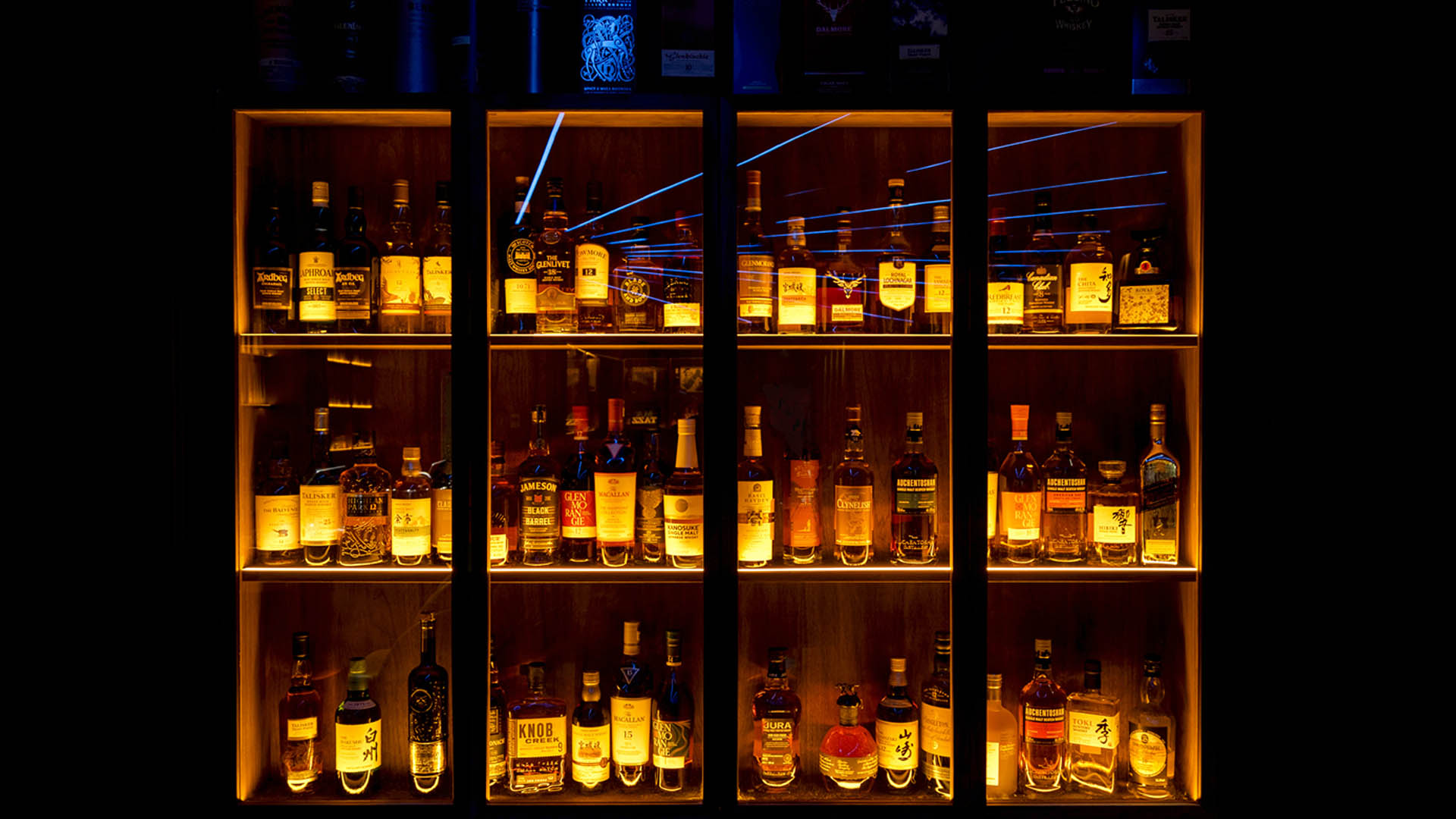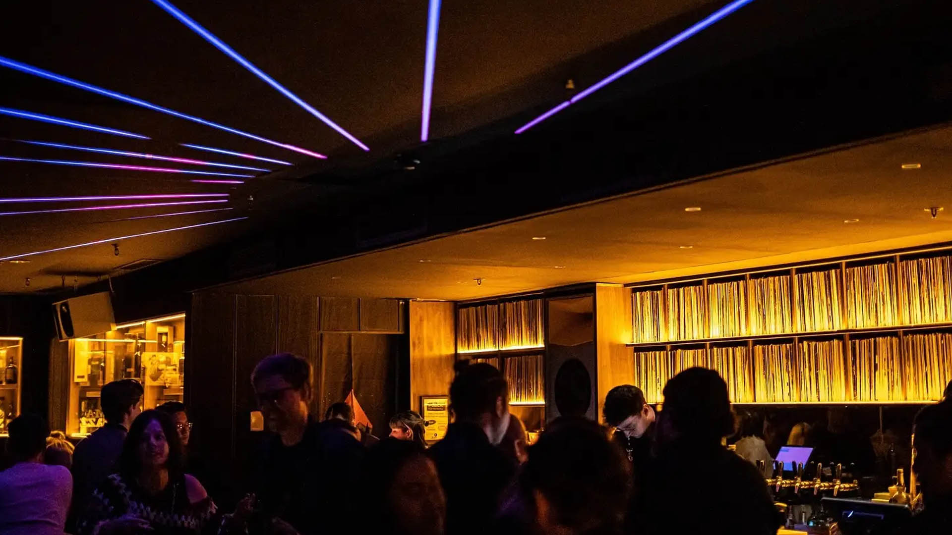Complementing the feature ceiling, Kenderdine also integrated 35 metres of LED strip into bespoke whisky and vinyl display cabinetry. The warm amber glow enhances the rich tones of rare bottles and record spines, reinforcing the venue’s luxurious aesthetic.