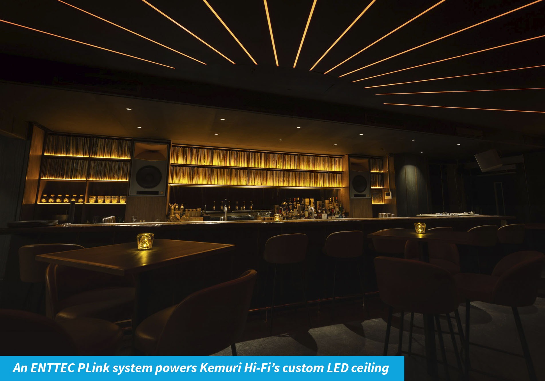 For Kemuri Hi-Fi, the brief was bold: create a ceiling capable of behaving like an old-school graphic equaliser: responding to sound in the room, while also offering refined, programmable ambience for quieter evenings.